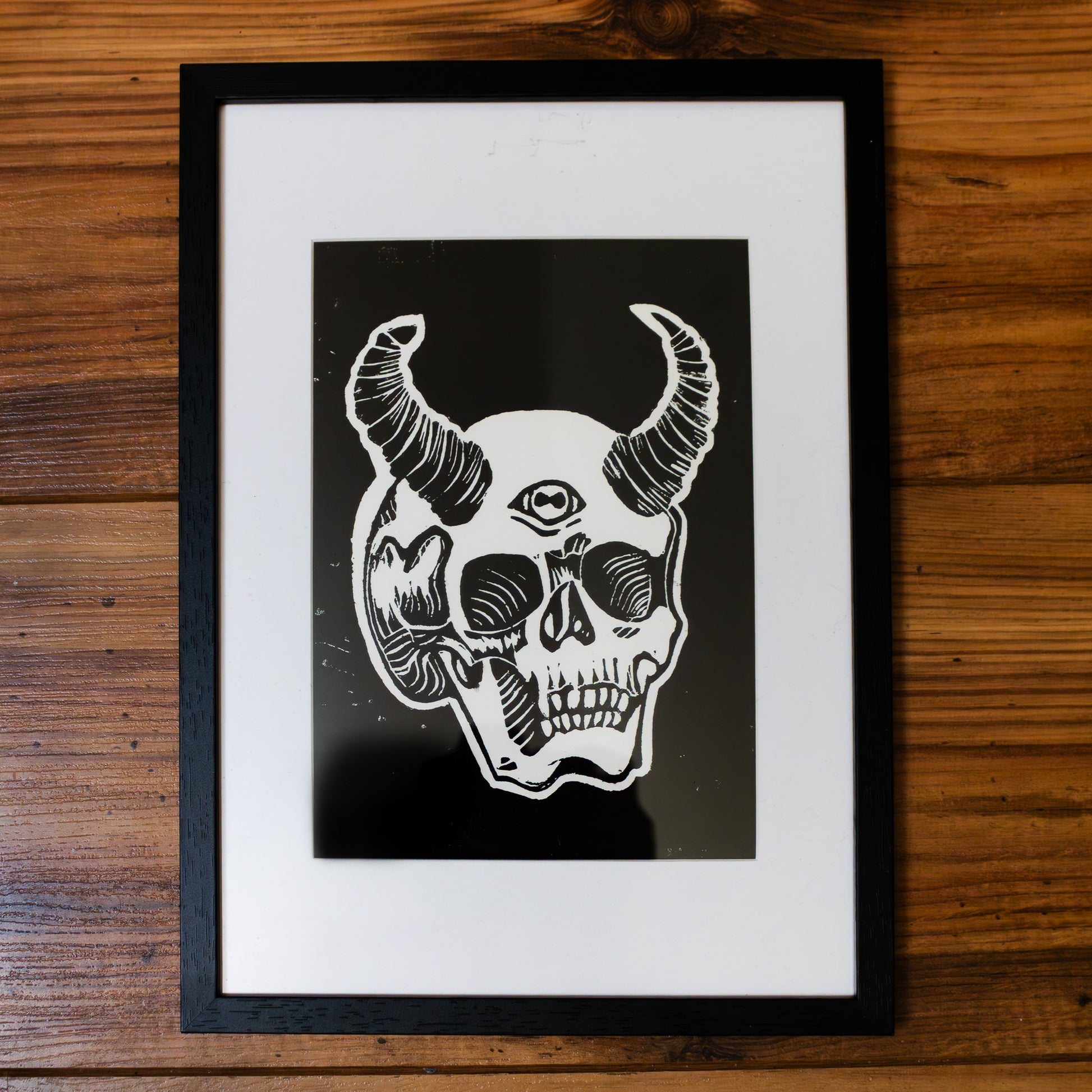 Printed in black, the horned skull is the iconic gothic piece suited for any skull-loving enthusiast. Available both framed and unframed.