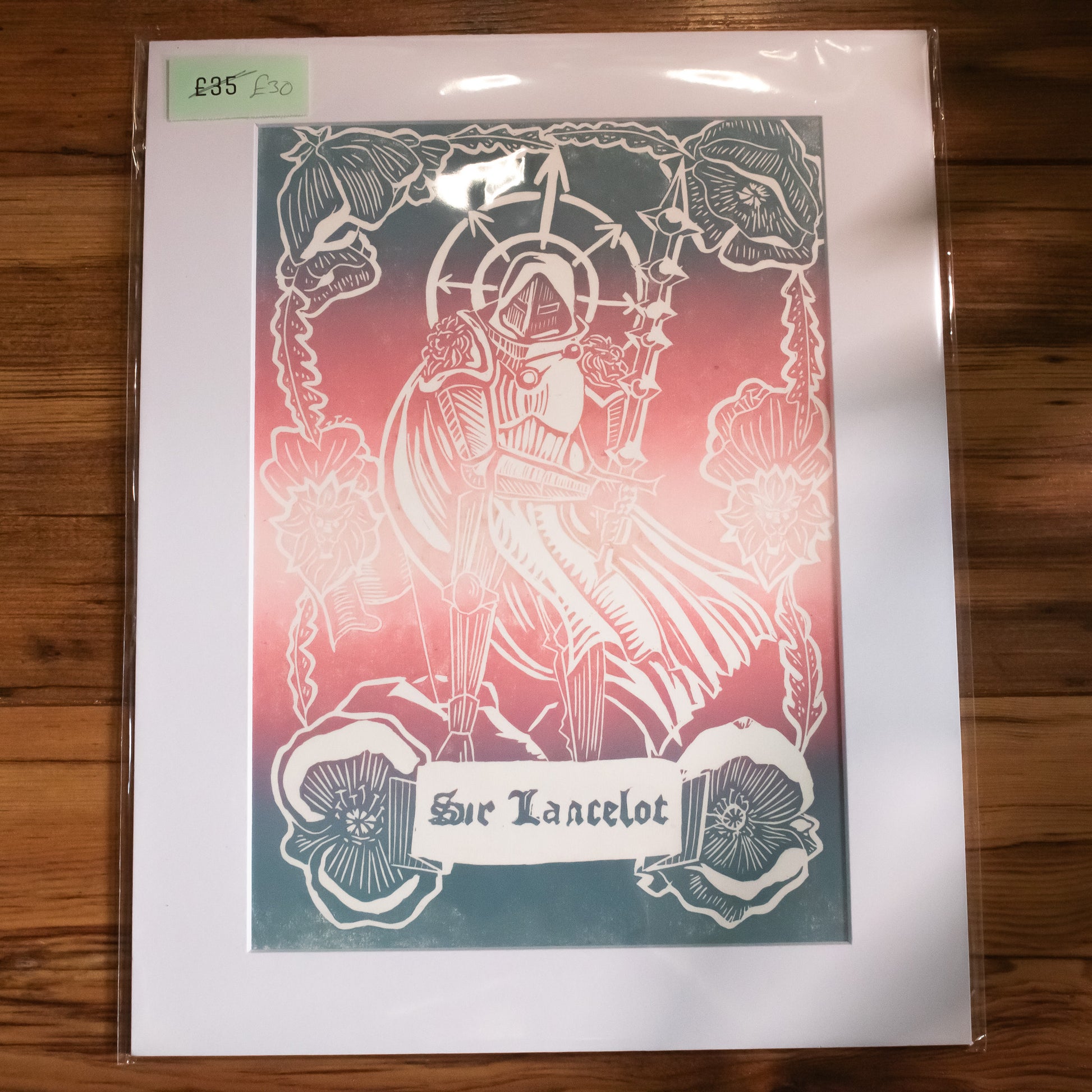 Inspired by Arthurian Legend, this linoprint details the knight Sir Lancelot surrounded by flowers and lion heads.