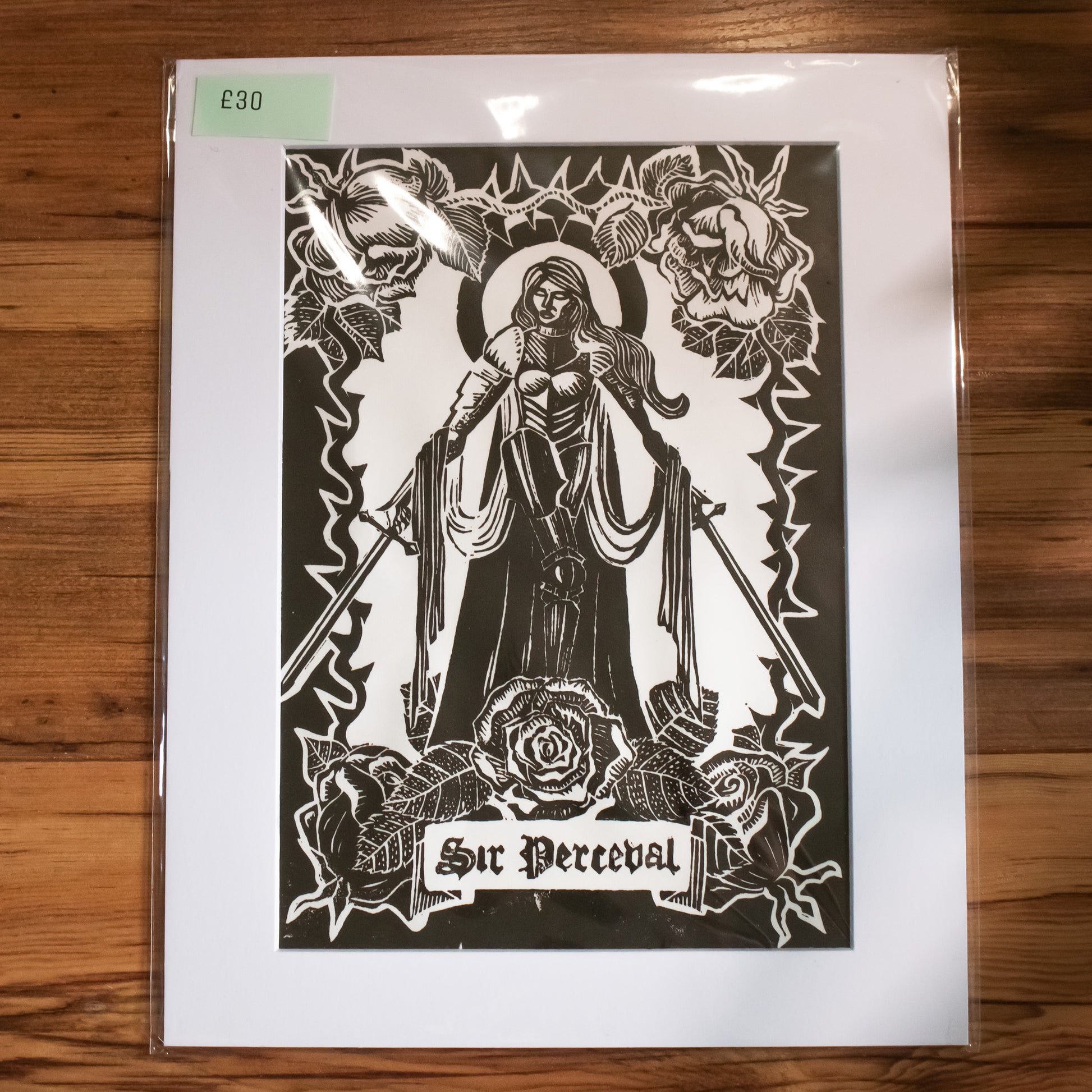 Inspired by Arthurian Legend, this linoprint details the knight Sir Perceval surrounded by flowers and thorns.